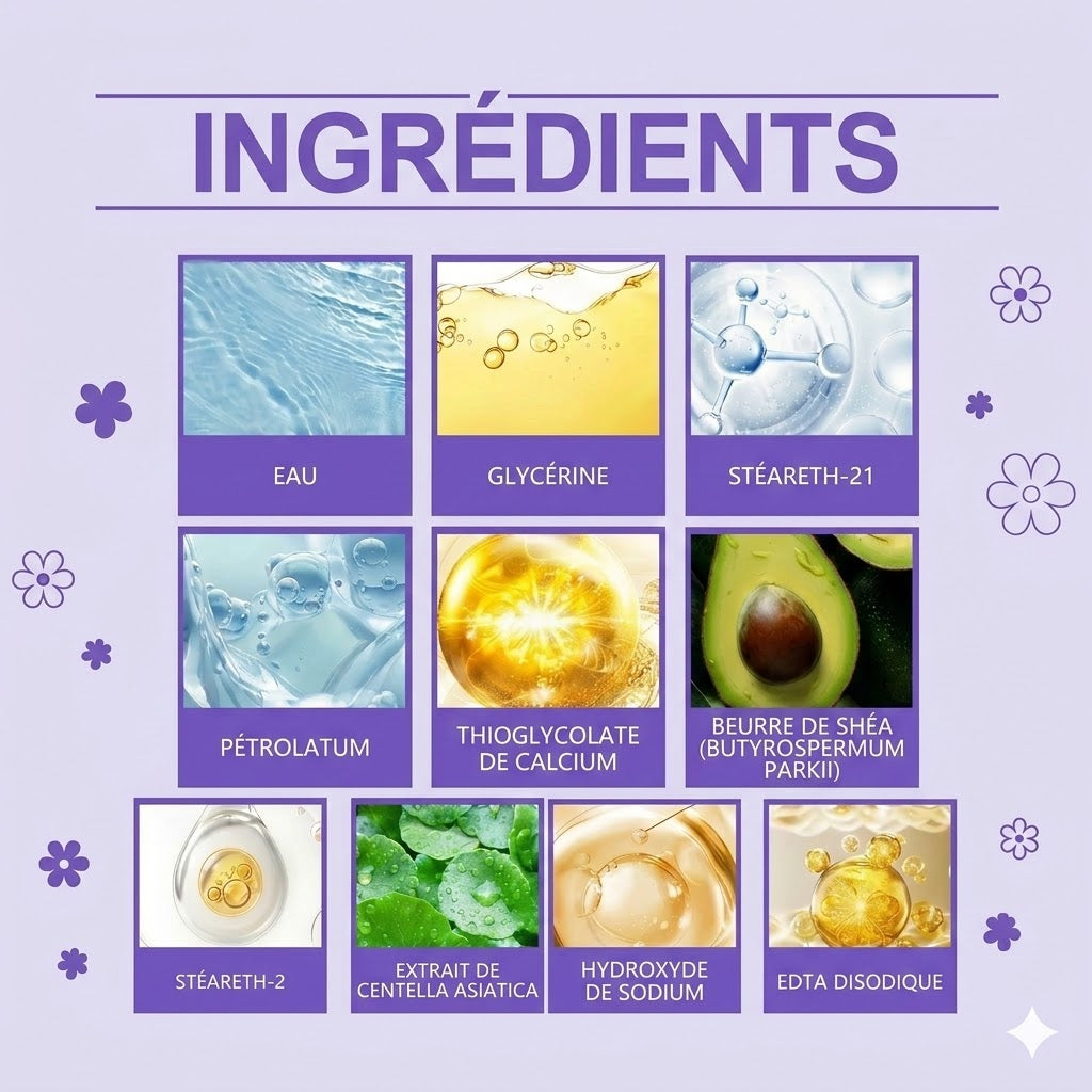Testée par des experts, notre formule enrichie en Centella Asiatica et beurre de karité nourrit intensément votre épiderme pendant l'épilation. Cette composition unique évite le dessèchement et soutient la récupération immédiate de la peau, garantissant un toucher velouté après chaque utilisation. L'absence de produits chimiques agressifs et son parfum frais assurent une sécurité garantie pour les peaux sensibles, vous offrant une apparence saine et hydratée sans les odeurs désagréables des produits classiques.