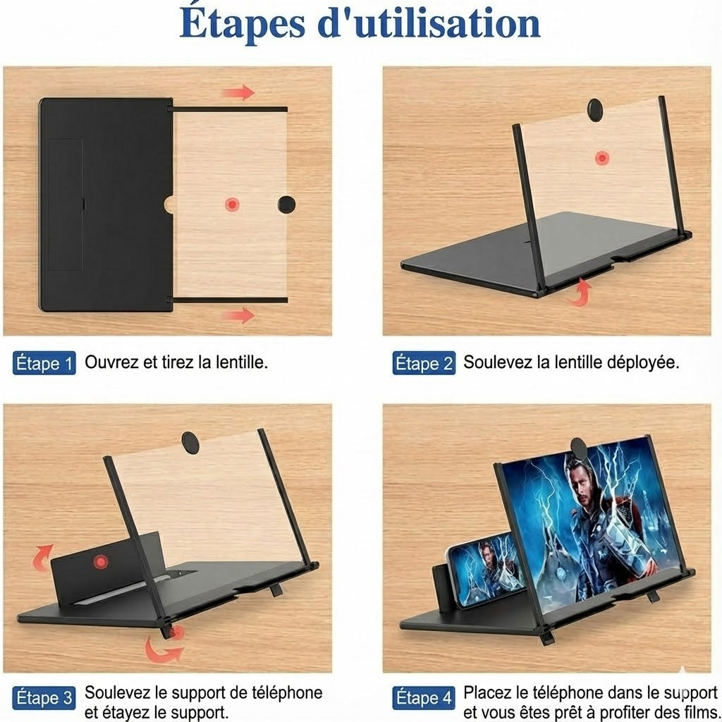 Arrêtez de plisser les yeux devant un écran minuscule. Offrez à votre vue le repos qu'elle mérite grâce à cet amplificateur d'écran innovant. En une seconde, il transforme votre téléphone en un écran de visionnage confortable, agrandissant l'image de 2 à 4 fois pour une expérience ultime. Que vous suiviez un match de la Coupe du Monde ou que vous "binge-watchiez" votre série préférée, le plexiglas HD offre un effet stéréoscopique ultra-net. Profitez immédiatement d'une image grand format sans avoir à investir dans des tablettes ou téléviseurs coûteux.