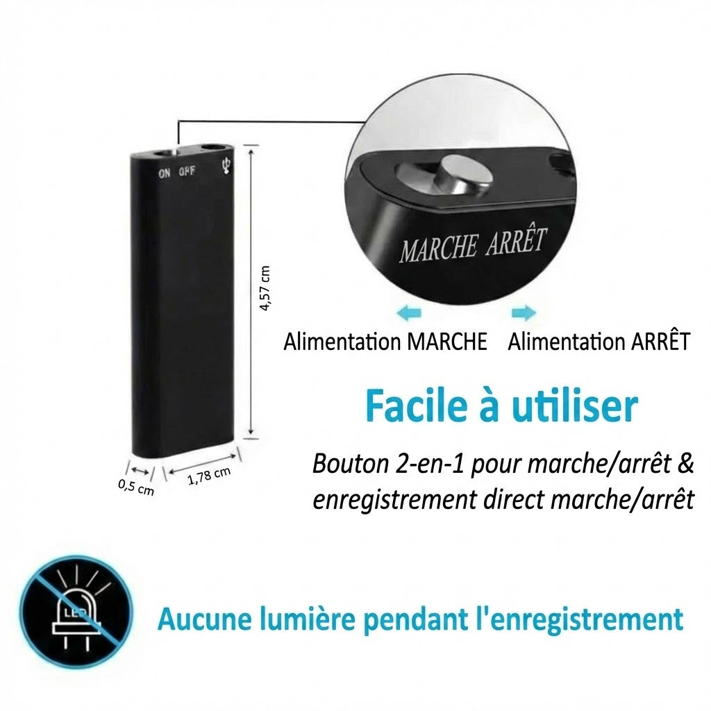 Avec des dimensions de seulement 47 par 19 mm, cet enregistreur redéfinit la portabilité pour se glisser absolument partout. Son design ultra-fin et léger résout instantanément le problème du matériel encombrant et trop visible, permettant une discrétion totale en toute circonstance. Grâce à sa commande intuitive à bouton unique, cet appareil est extrêmement simple à utiliser, vous permettant de déclencher un enregistrement en un éclair même dans les situations imprévues, ce qui augmente directement votre efficacité au travail.