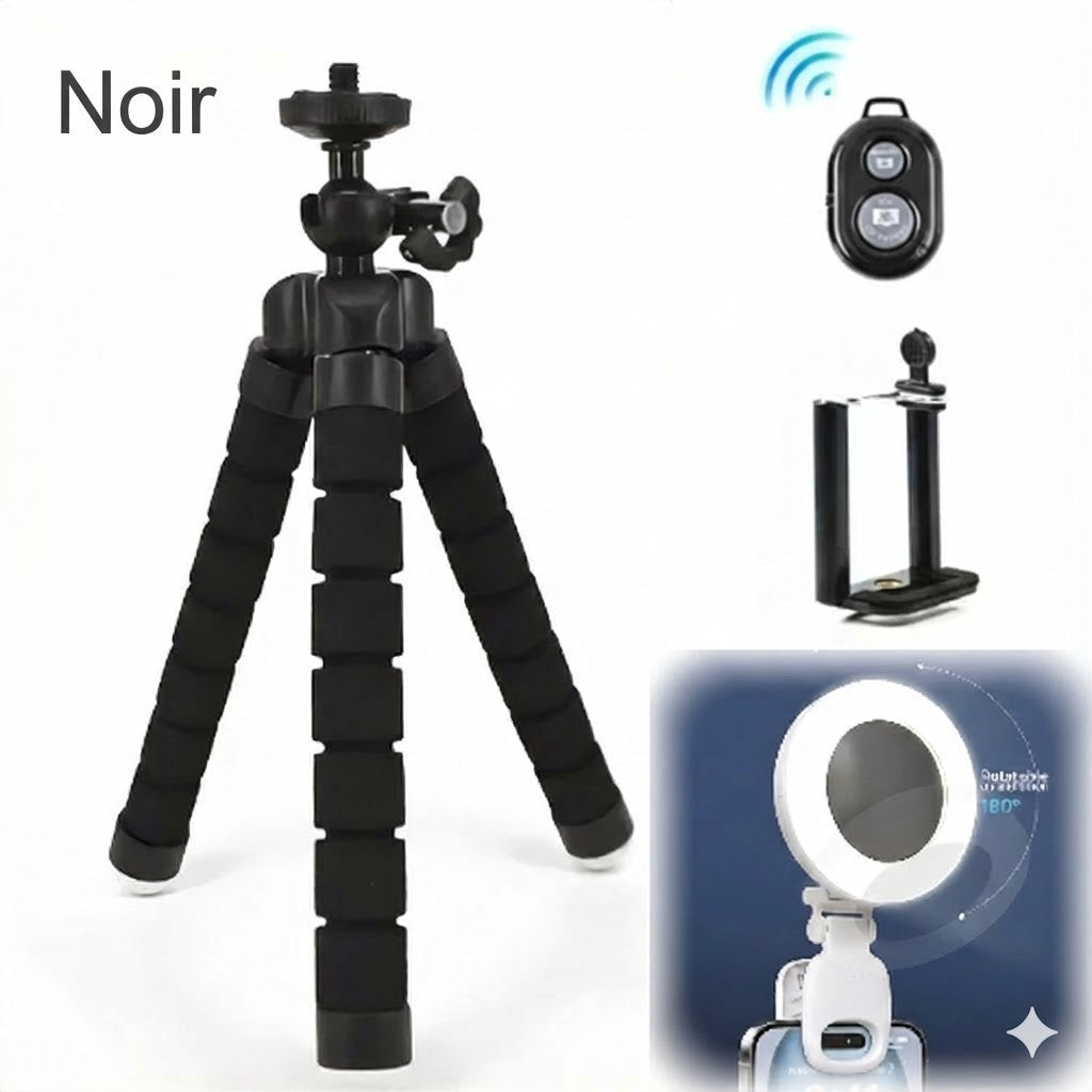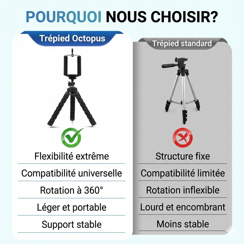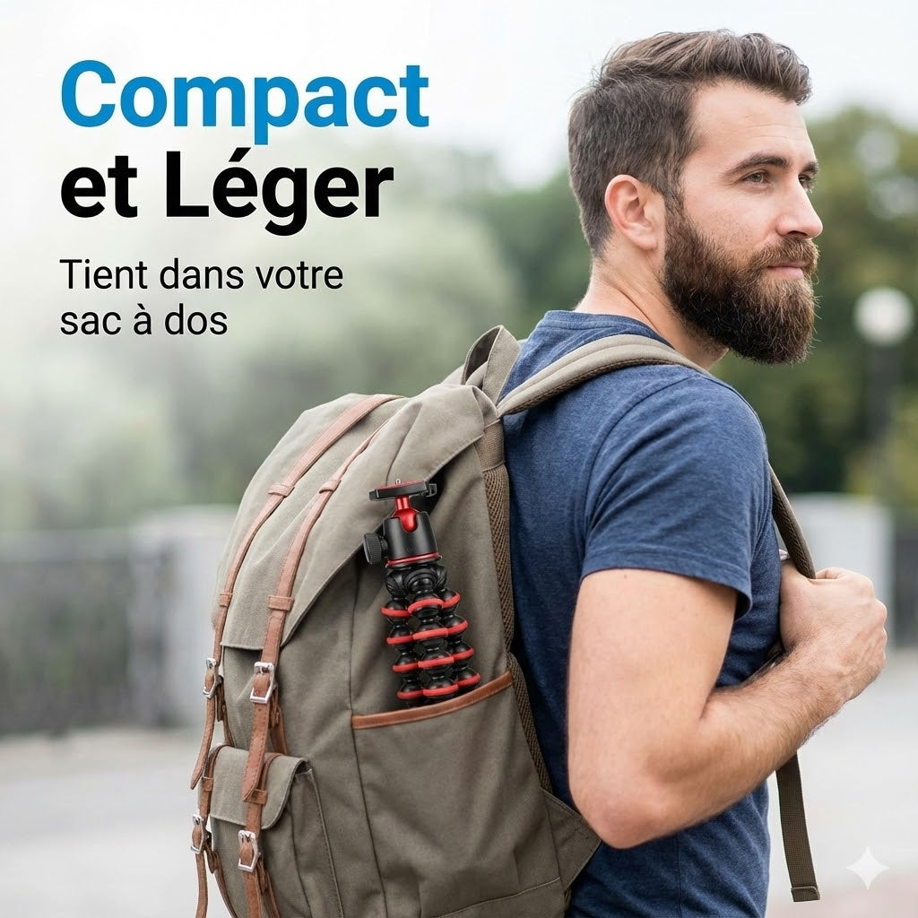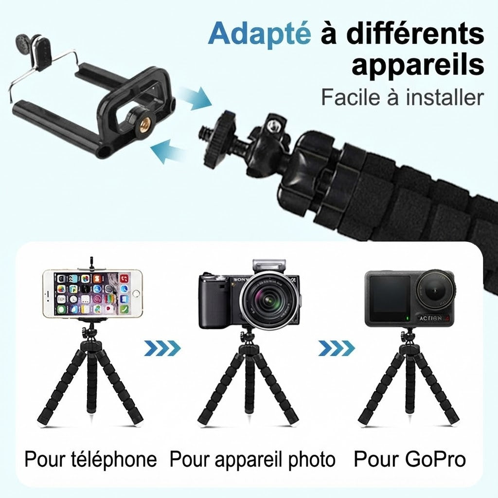 Marre des photos floues et des installations précaires ? Avec le mini trépied Octopus, profitez d'une flexibilité extrême que les modèles classiques ne peuvent offrir. Que vous l'accrochiez à une branche, l'enrouliez autour d'une barrière ou le posiez sur un rocher instable, vous obtenez un support stable instantané pour des résultats professionnels. Ce trépied multifonction règle immédiatement le problème des angles limités, vous permettant de créer le cliché parfait partout et à tout moment.