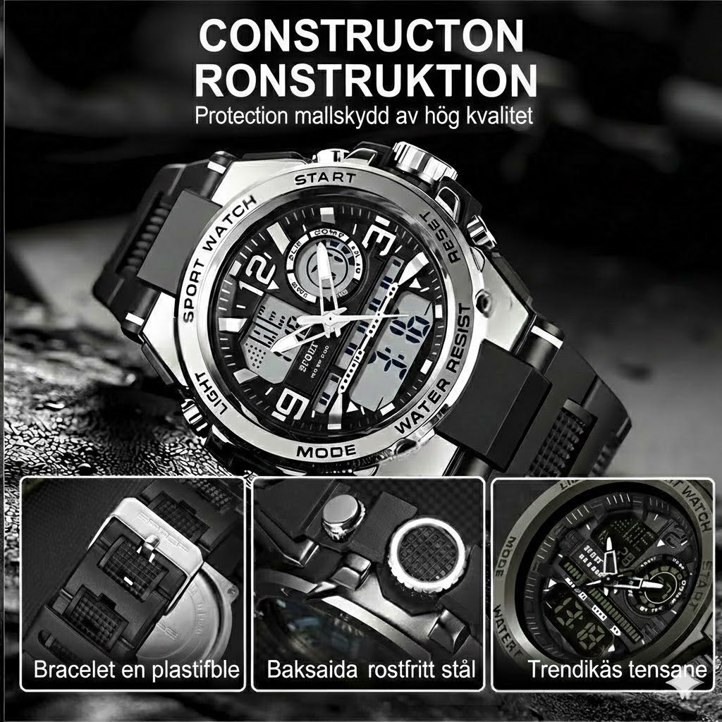 Conçue pour l'action pure, cette montre dispose d'une structure antichoc ultra-robuste capable de résister aux chutes accidentelles et aux impacts les plus violents. Elle s'impose comme votre partenaire le plus fiable pour les sports extrêmes et les activités de plein air. Ne craignez plus d'abîmer votre équipement dans des conditions difficiles ; ce design indestructible est pensé pour durer là où les autres échouent. Cette fiabilité vous permet de vous dépasser avec l'assurance d'un résultat immédiat en termes de durabilité et de résistance.
