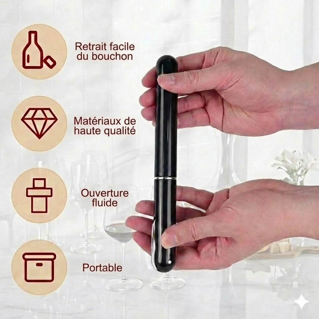 Oubliez la frustration des bouchons qui se cassent et finissent par gâcher votre grand cru. Cet ouvre-bouteille 2-en-1 innovant utilise la pression de l'air pour retirer les bouchons facilement et en un seul morceau, sans risque de les effriter. Grâce au coupe-capsule intégré, vous préparez la bouteille en un clin d'œil. Ce système intelligent résout immédiatement le problème des miettes de liège, vous garantissant de toujours déguster un verre de vin pur, qu'il s'agisse d'un bouchon naturel ou synthétique.